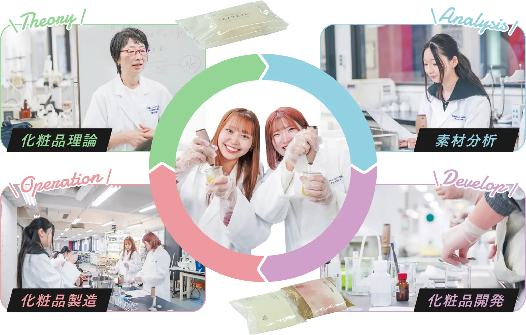 化学や生物学の基礎をしっかり学び、化粧品やスキンケア製品の開発に必要な専門的な知識を習得します。理論を実践に結びつけるこで、製品設計に欠かせないスキルを身につけます。