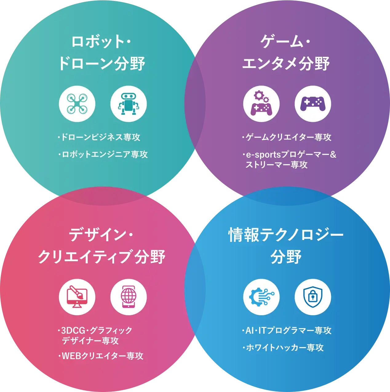 半年間にわたり様々な分野を体験することで、自分に合った分野や興味を発見していきます。プログラミング、情報処理、ゲーム、デザイン、ドローン、ロボットなど、「好き・得意」と思えるゾーンを見つけることが目的です。