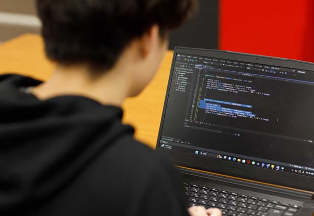 基板設計や回路構築を通じて電子機器の仕組みを理解し、プログラミング、センサーやモーターを使った動作を学習します。