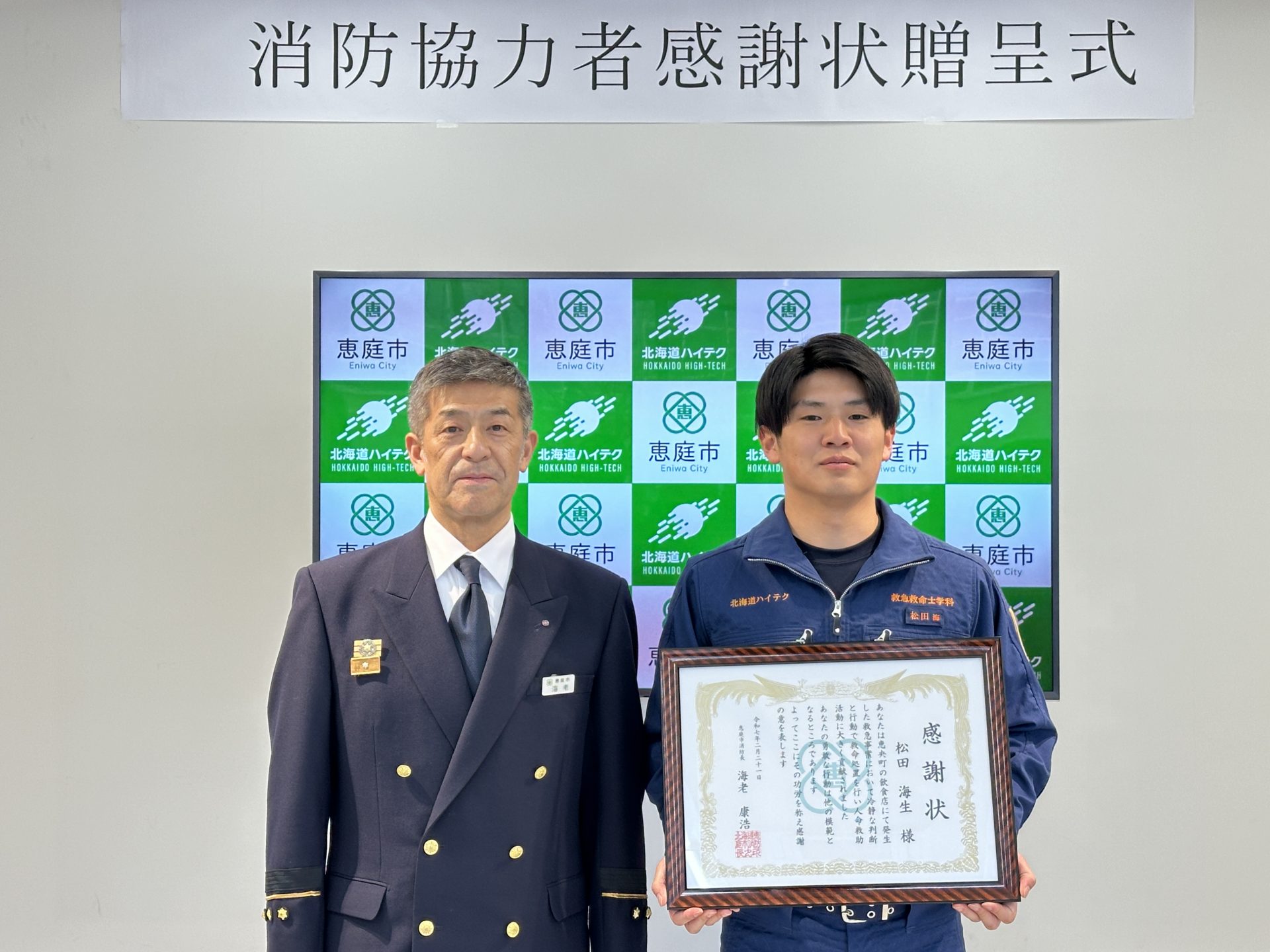 この勇敢な行動は恵庭市消防本部からも高く評価され、2025年2月21日には恵庭市消防長 海老様、消防署長 児玉様より感謝状が贈呈されました。