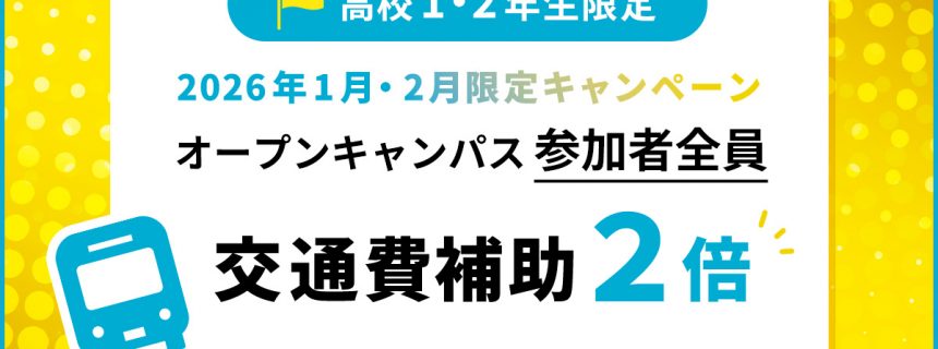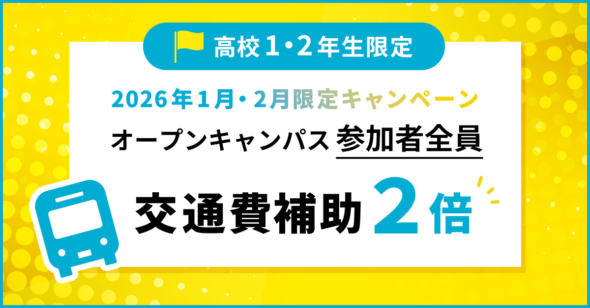 1〜2月限定で、オープンキャンパス参加時の交通費補助が通常の2倍になる特別キャンペーンを実施します。