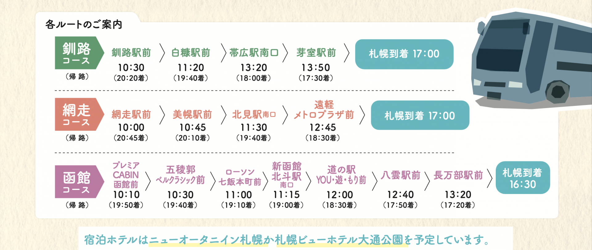 宿泊付無料送迎バス:網走・北見コース、函館コース、釧路・帯広コース